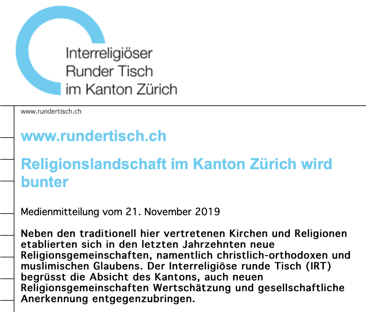«Neben den traditionell hier vertretenen Kirchen und Religionen etablierten sich in den letzten Jahrzehnten neue Religionsgemeinschaften, namentlich christlich-orthodoxen und muslimischen Glaubens. Der Interreligiöse runde Tisch (IRT) begrüsst die Absicht des Kantons, auch neuen Religionsgemeinschaften Wertschätzung und gesellschaftliche Anerkennung entgegenzubringen.»