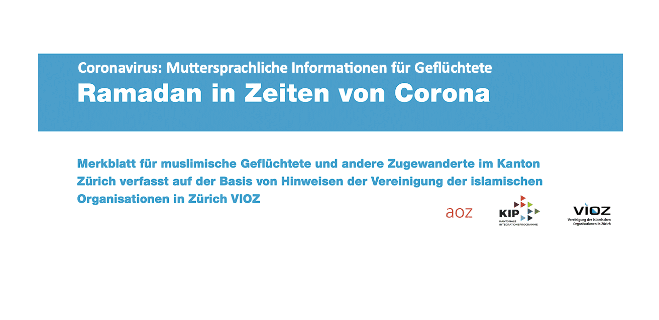 Das Merkblatt Ramadan in Zeiten von Corona ist in Zusammenarbeit mit der Vereinigung der Islamischen Organisationen in Zürich VIOZ und der Fachstelle Integration des Kantons Zürich FI entstanden. Es macht Verhaltensempfehlungen und gibt unter anderem Hinweise zum Fastenbrechen und zu den Gebeten. Es steht in 10 Sprachen zum Download bereit (Stand 21. April 2020).