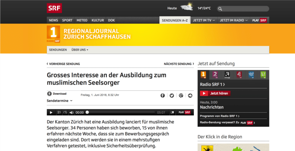 SRF Regionaljournal vom 1. Juni 2018: «Grosses Interesse an der Ausbildung zum muslimischen Seelsorger»