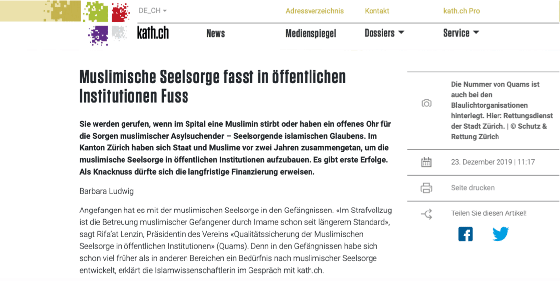 «Sie werden gerufen, wenn im Spital eine Muslimin stirbt oder haben ein offenes Ohr für die Sorgen muslimischer Asylsuchender – Seelsorgende islamischen Glaubens. Im Kanton Zürich haben sich Staat und Muslime vor zwei Jahren zusammengetan, um die muslimische Seelsorge in öffentlichen Institutionen aufzubauen. Es gibt erste Erfolge. Als Knacknuss dürfte sich die langfristige Finanzierung erweisen.»