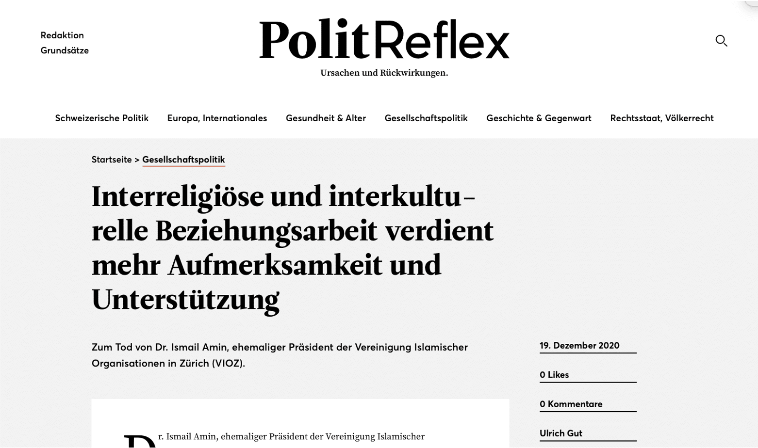 Ein Kommentar von Dr. Ulrich Gut «Zum Tod von Dr. Ismail Amin, ehemaliger Präsident der Vereinigung Islamischer Organisationen in Zürich (VIOZ).»