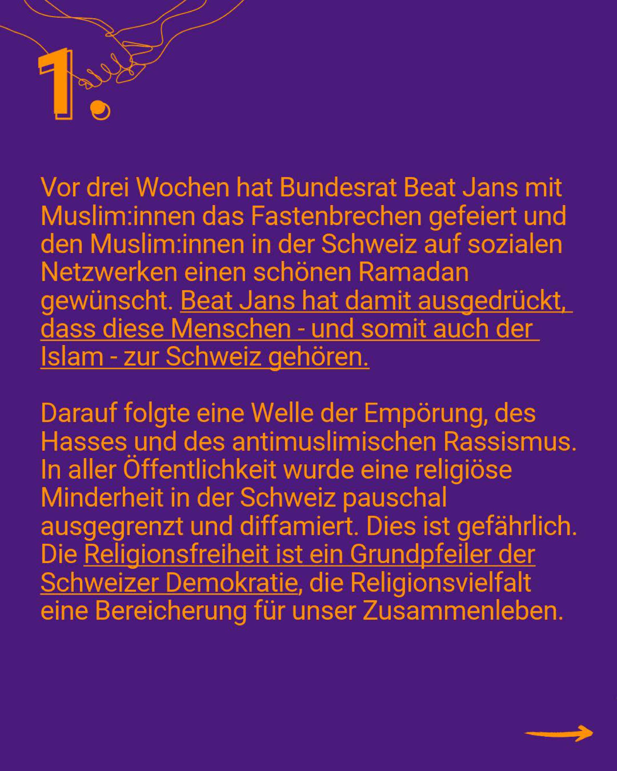 - Vor drei Wochen hat Bundesrat Beat Jans mit Muslim:innen das Fastenbrechen gefeiert und den Muslim:innen in der Schweiz auf sozialen Netzwerken einen schönen Ramadan gewünscht. Beat Jans hat damit ausgedrückt, dass diese Menschen – und somit auch der Islam – zur Schweiz gehören. Darauf folgte eine Welle der Empörung, des Hasses und des antimuslimischen Rassismus. In aller Öffentlichkeit wurde eine religiöse Minderheit in der Schweiz pauschal ausgegrenzt und diffamiert. Dies ist gefährlich. Die Religionsfreiheit ist ein Grundpfeiler der Schweizer Demokratie, die Religionsvielfalt eine Bereicherung für unser Zusammenleben.