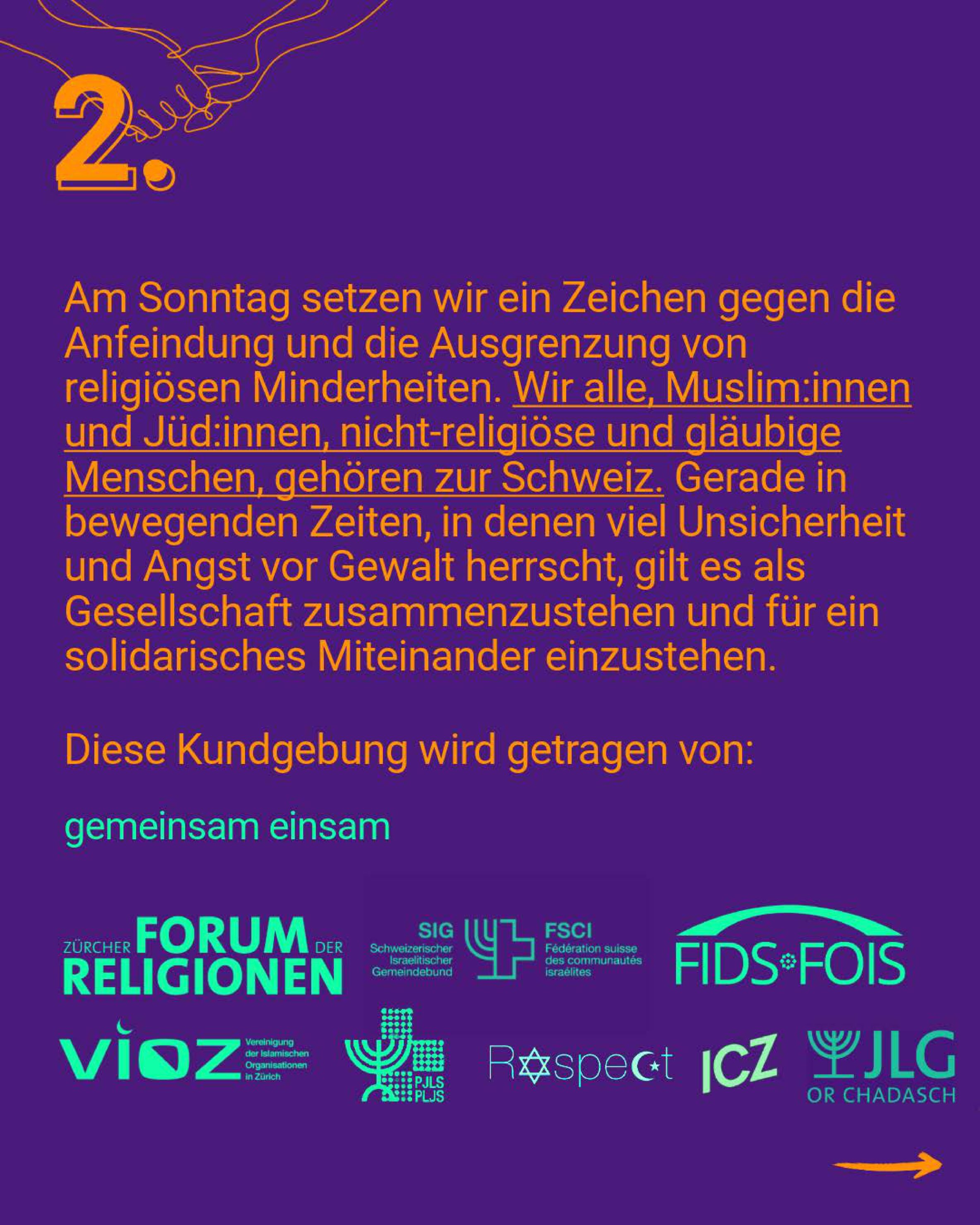 - Am Sonntag setzen wir an Zeichen gegen die Anfeindung und die Ausgrenzung von religiösen Minderheiten. Wir alle, Muslim:innen und Jüd:innen, nicht-religiöse und gläubige Menschen, gehören zur Schweiz. Gerade in bewegenden Zeiten, in denen viel Unsicherheit und Angst vor Gewalt herrscht, gilt es als Gesellschaft zusammenzustehen und für ein solidarisches Miteinander einzustehen.