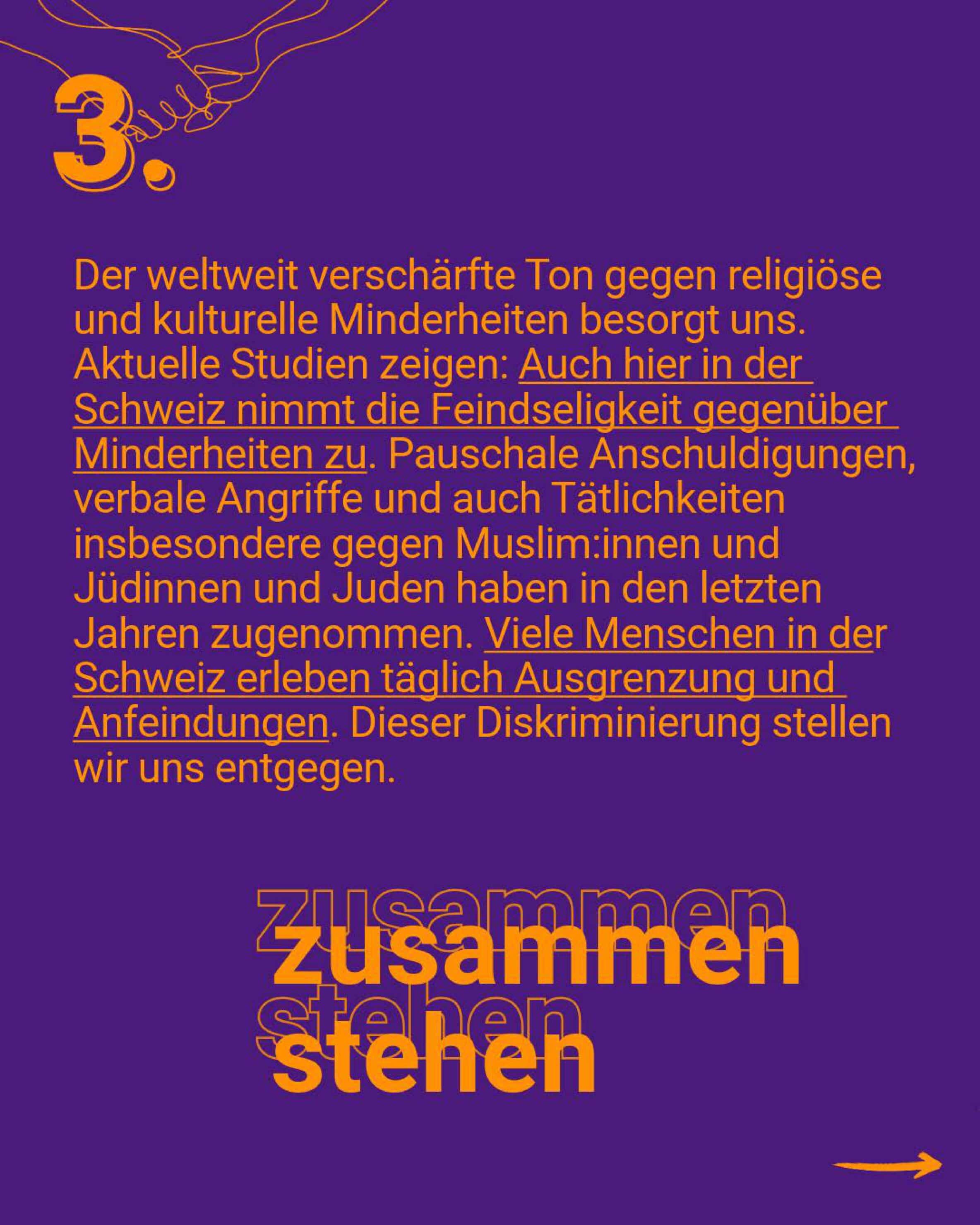 - Der weltweit verschärfte Ton gegen religiöse und kulturelle Minderheiten besorgt uns. Aktuelle Studien zeigen: Auch her in der Schweiz nimmt die Feindseligkeit gegenüber Minderheiten zu. Pauschale Anschuldigungen, verbale Angriffe und auch Täitlichkeiten insbesondere gegen Muslim:innen und Jüdinnen und Juden haben in den Ietzten Jahren zugenommen. Viele Menschen in der Schweiz erleben täglich Ausgrenzung und Anfeindungen. Dieser Diskriminierung stellen wir uns entgegen.