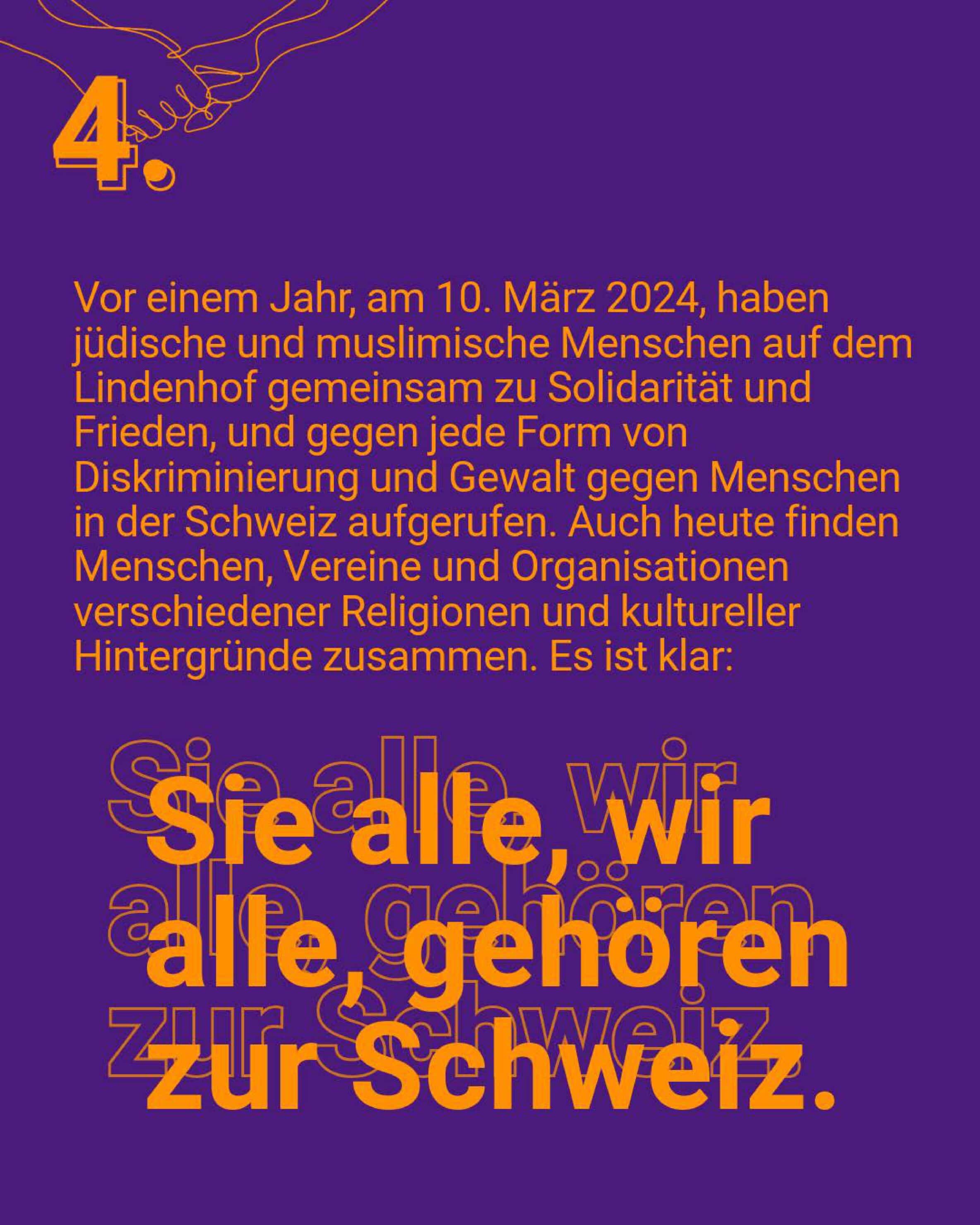 - Vor einem Jahr, am 10. März 2024, haben jüdische und muslimische Menschen auf dem Lindenhof gemeinsam zu Solidarität und Frieden, und gegen jede Form von Diskriminierung und Gewalt gegen Menschen in der Schweiz aufgerufen. Auch heute finden Menschen, Vereine und Organisationen verschiedener Religionen und kultureller Hintergründe zusammen. Es ist klar: