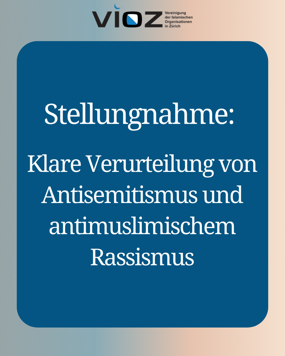 Die Vereinigung der Islamischen Organisationen in Zürich (VIOZ) verurteilt den antisemitisch motivierten tätlichen Angriff auf einen jüdischen Mann in der Stadt Zürich vom 2. Februar 2026 aufs Schärfste. Die VIOZ spricht dem Betroffenen, seiner Familie sowie der jüdischen Gemeinschaft ihre volle Solidarität und ihr tiefes Mitgefühl aus.