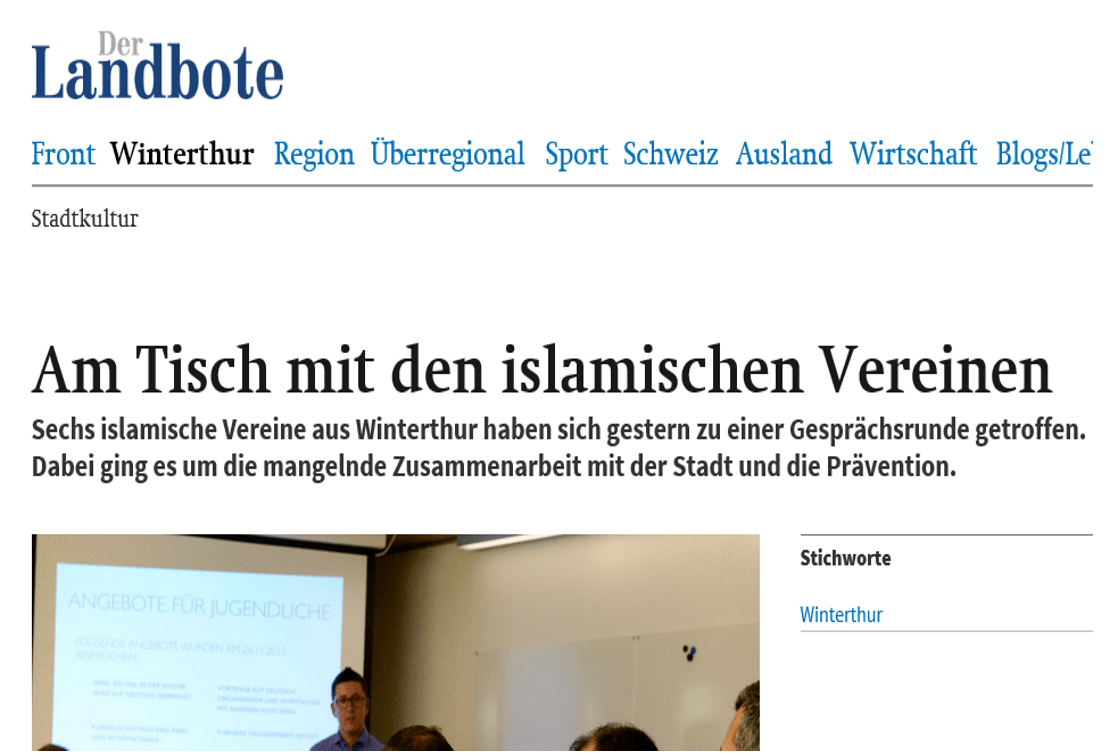 Zu dem Treffen lud der neue Verein «FAIR Winti» unter der Leitung von Blerim Bunjaku alle muslimischen Vereinigungen aus Winterthur ein, so dass drei türkisch-islamische Vereinigungen, zwei albanisch-islamische Vereine sowie vier Vertreter der An’ Nur-Moschee in Hegi teilnahmen.